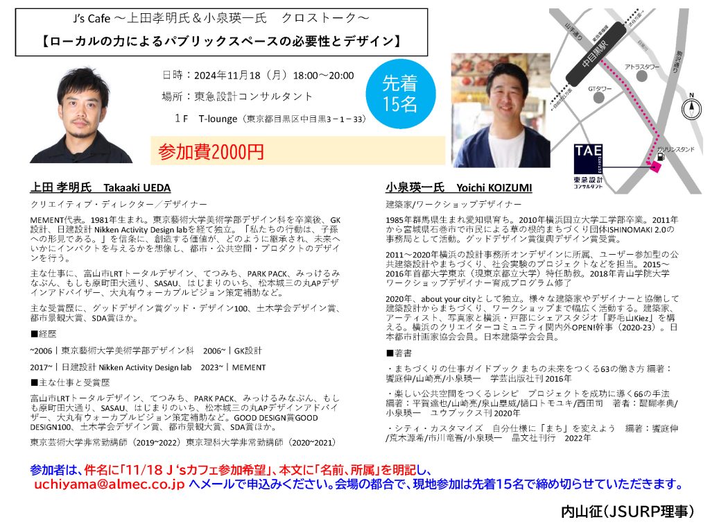 下記の通り、J’s Cafeを開催します。ご都合つきます方はぜひこの機会にj's cafeにご参加ください。定員に限りがありますので、お早目のお申し込みをお願いいたします。 ~上田孝明氏&小泉瑛一氏 クロストーク~ 【ローカルの力によるパブリックスペース...